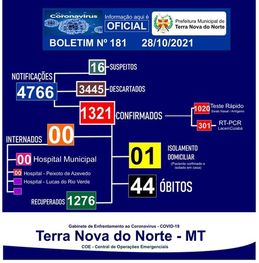 Casos de Covid atualizados em Terra nova do norte, dia 28 de outubro.