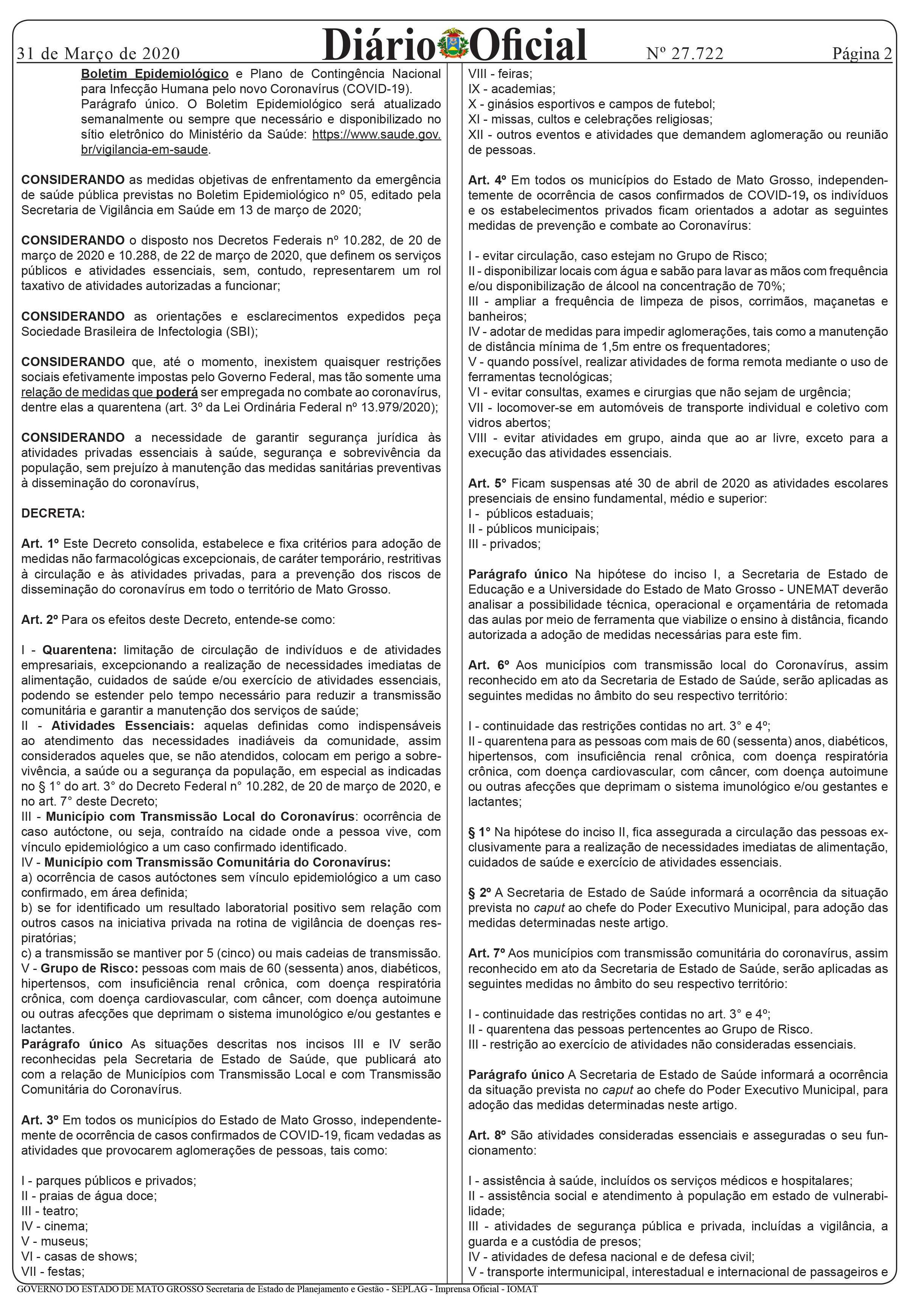 CORONAVÍRUS: Governo de MT publica novo decreto e aumenta restrições a estabelecimentos comerciais para promover isolamento social