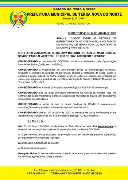 A Prefeitura Municipal publicou um decreto oficial neste dia 04 de julho recomendando a volta do uso de máscara em locais públicos, privados ou ambientes fechados em todo o território municipal.
