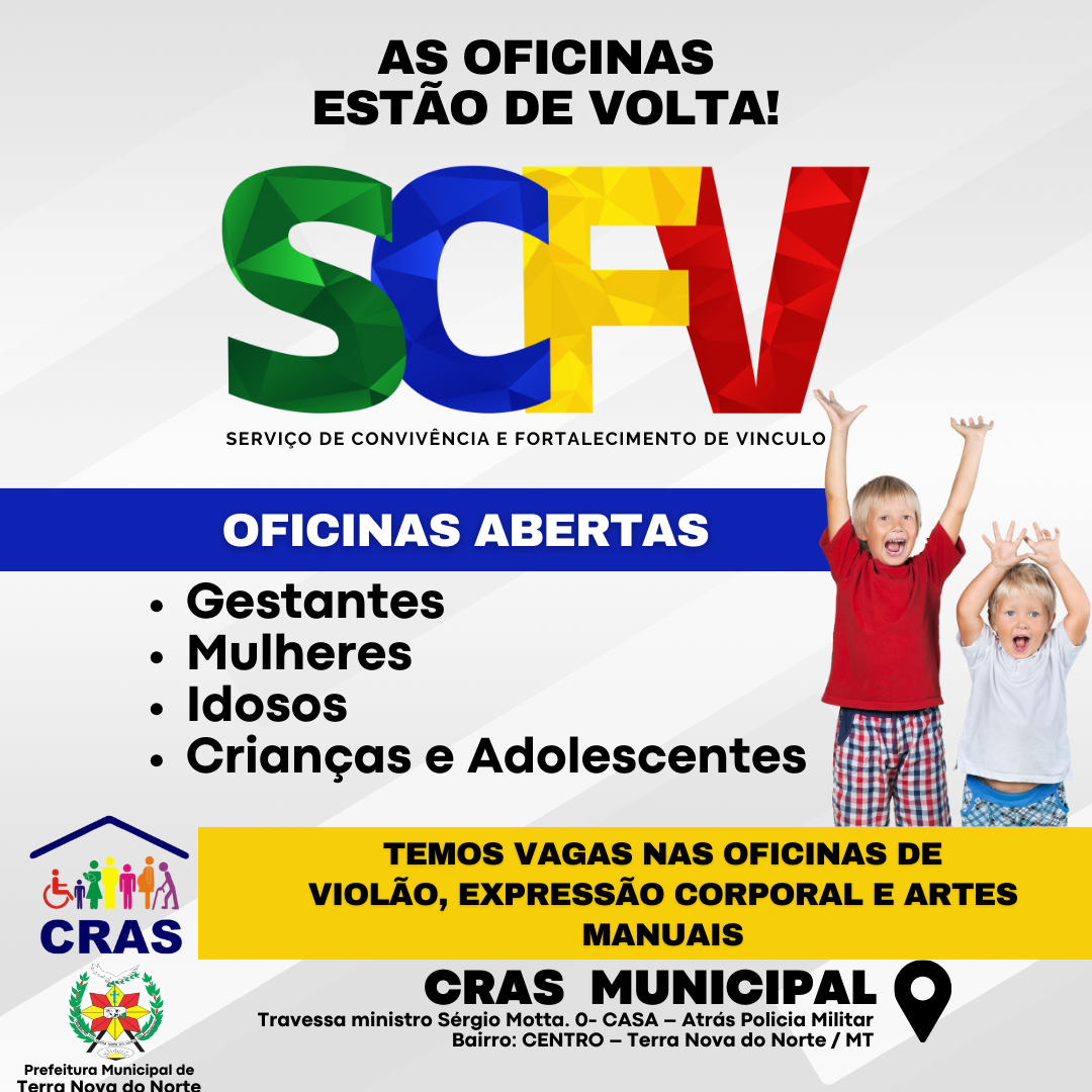 O Centro de Referência de Assistência Social (CRAS) de Terra Nova do Norte oferece diversas oficinas gratuitas para as pessoas inscritas no Cadastro Único, através do SCFV Serviço de Convivência e Fortalecimento de Vínculos.
