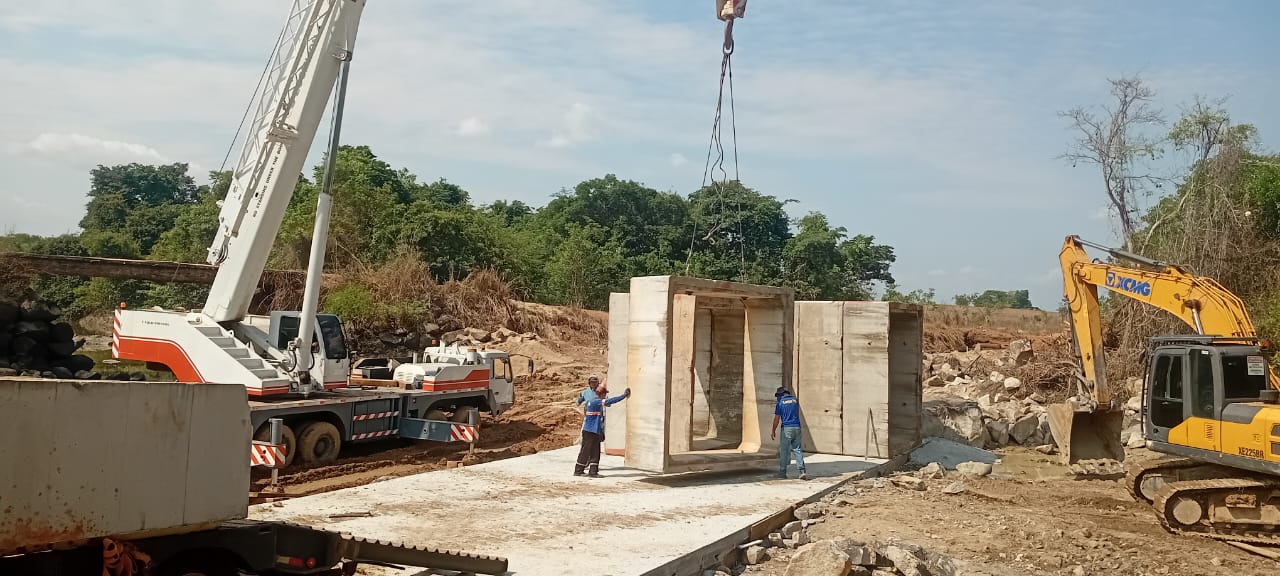 Com auxílio de um guindaste, um caminhão munck, uma PC e outros equipamentos a secretaria de governo coordenou os trabalhos de instalação das aduelas de concreto da nova ponde da Comunidade São Pedro.