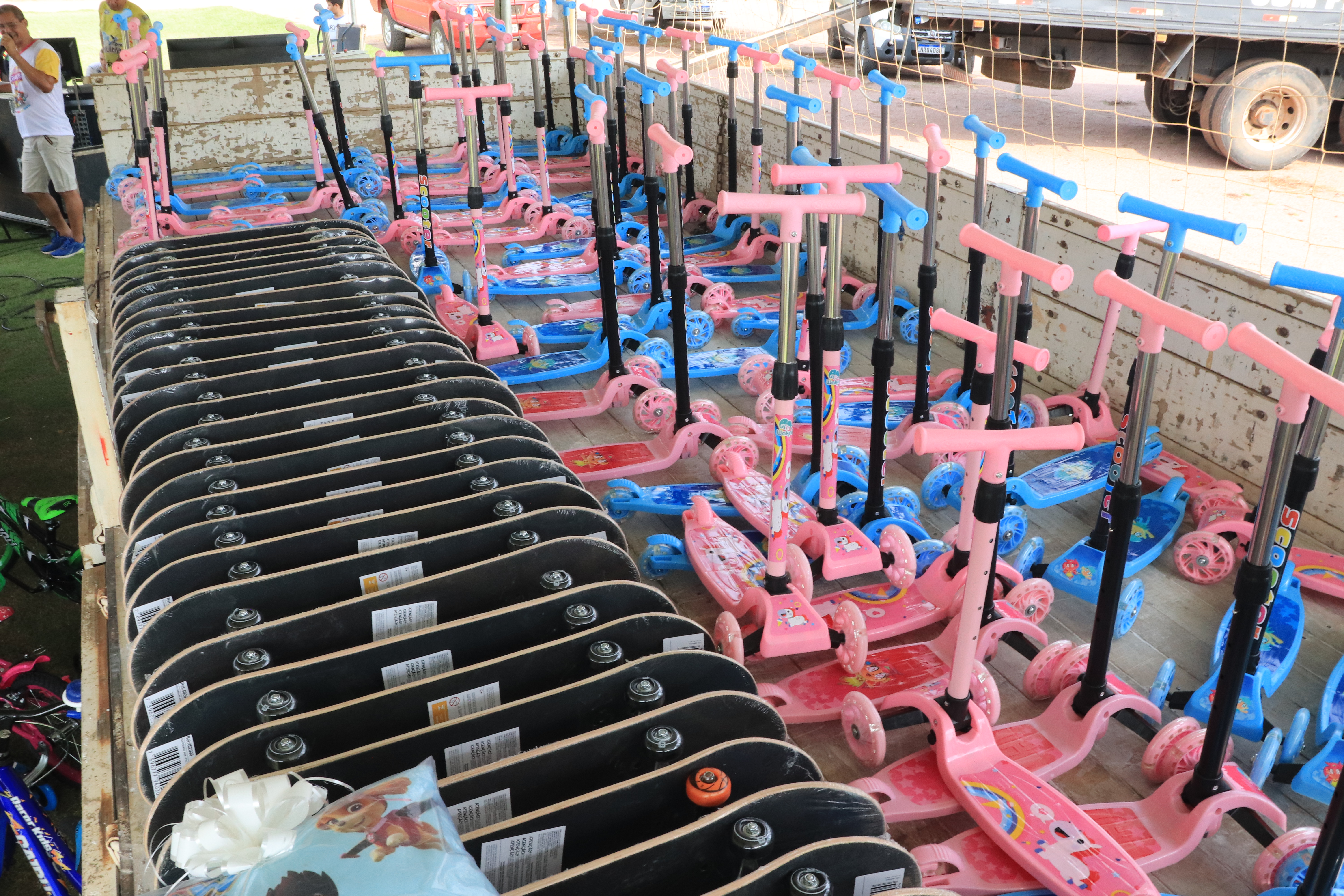 Um dos momentos mais esperados foi o sorteio de prêmios, incluindo patinetes, skates e bicicletas, que fizeram a alegria de muitos participantes.
