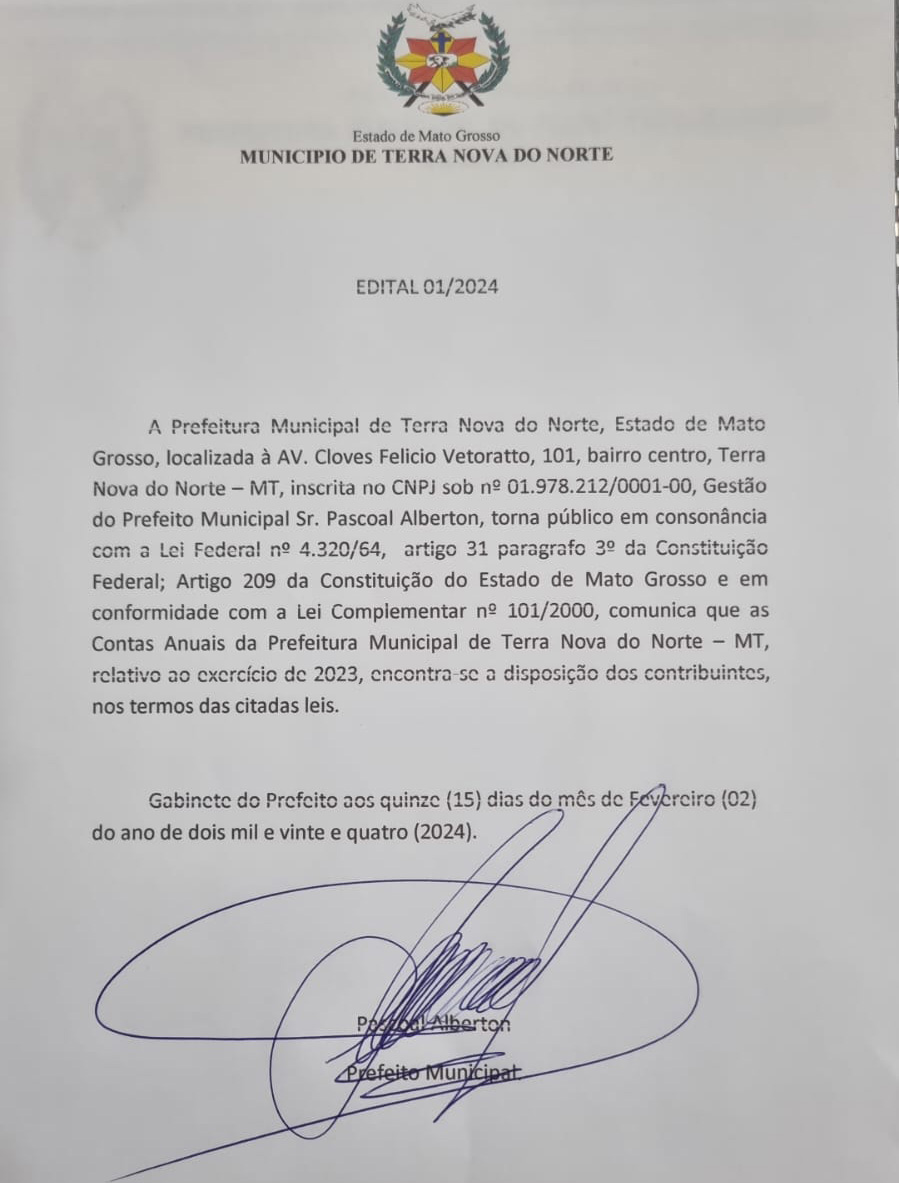 A Prefeitura Municipal de Terra Nova do Norte, Estado de Mato Grosso, localizada à AV. Cloves Felicio Vetoratto, 101, bairro centro, Terra Nova do Norte – MT, inscrita no CNPJ sob nº 01.978.212/0001-00, Gestão do Prefeito Municipal Sr. Pascoal Alberton, torna público em consonância com a Lei Federal nº 4.320/64, artigo 31 paragrafo 3º da Constituição Federal; Artigo 209 da Constituição do Estado de Mato Grosso e em conformidade com a Lei Complementar nº 101/2000, comunica que as Contas Anuais da Prefeitura Municipal de Terra Nova do Norte – MT, relativo ao exercício de 2023, encontra-se a disposição dos contribuintes, nos termos das citadas leis.