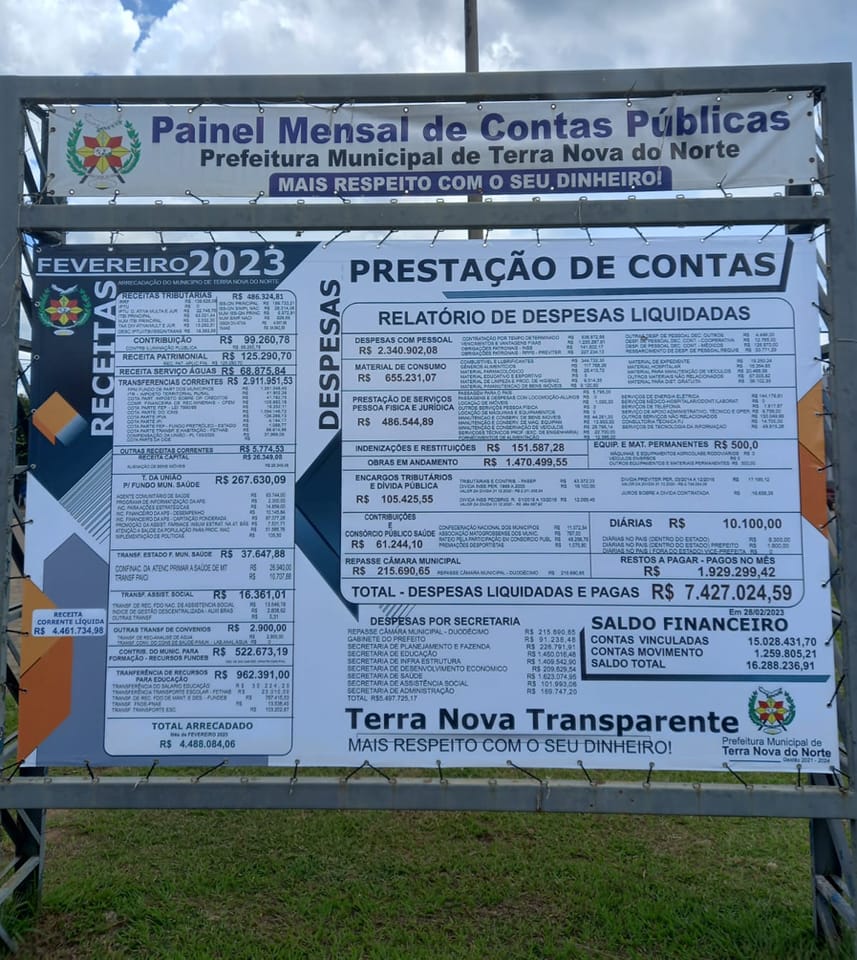 Prefeitura de Terra Nova do Norte continua meta da transparência colocando ao público painel de contas com balanço mensal de arrecadação e gastos