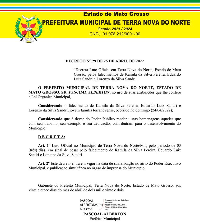 Prefeitura de Terra Nova do Norte decreta luto oficial pelo falecimento de família em acidente trágico no final de semana