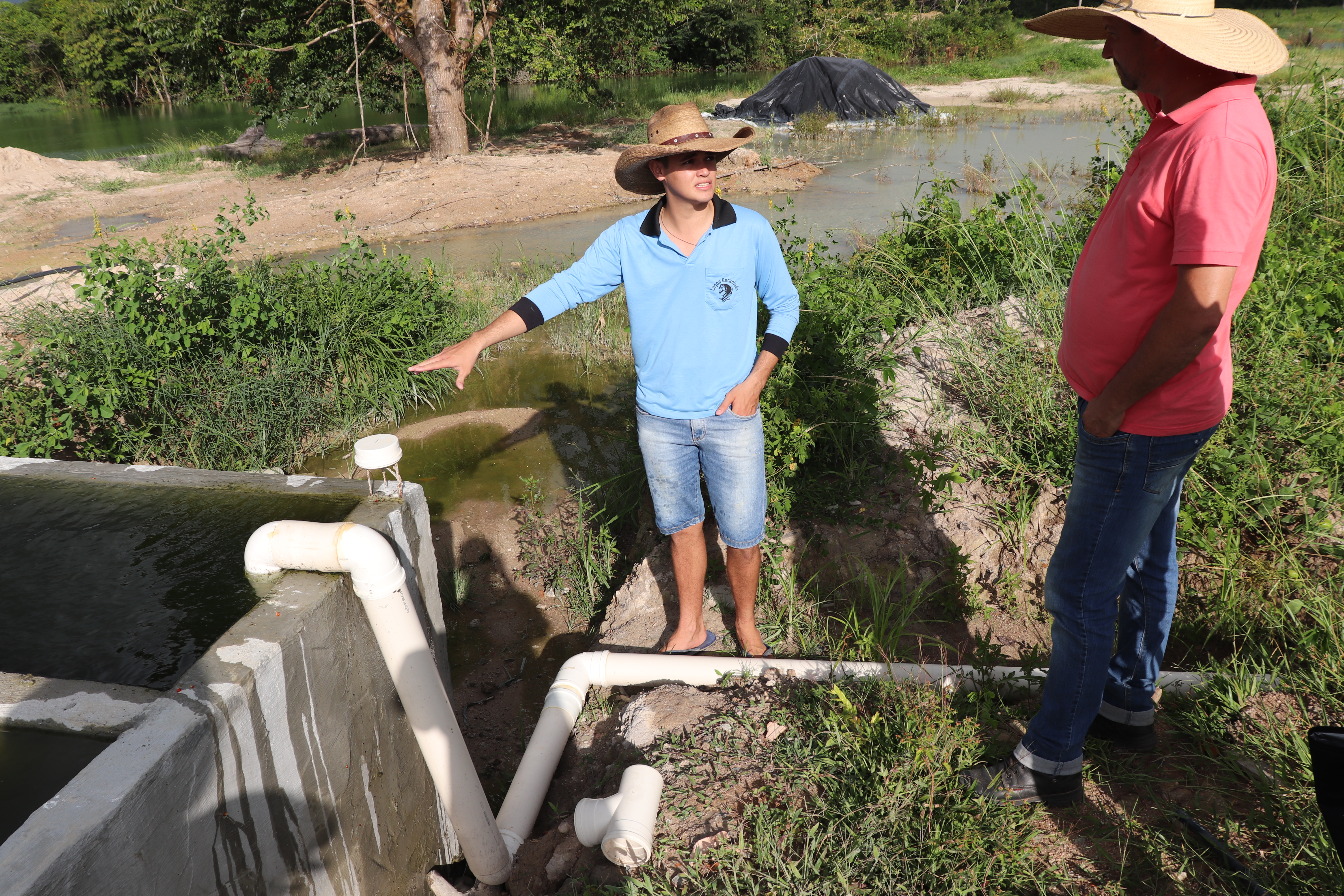 O produtor rural Leandro Martins dos Santos e seu filho Robert Gottardo dos Santos fazem parte do grupo de produtores que conta com apoio da Secretaria de Agricultura dentro do Programa de Incentivo da Piscicultura.