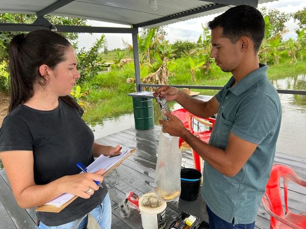 Cassiano e Elismara anotavam nos relatórios a evolução em cada propriedade, onde o peixe estava com menos de 180 gramas foi recomendado melhorar a alimentação e onde pesou mais de 250 gramas também foi orientado controlar a dosagem de ração.