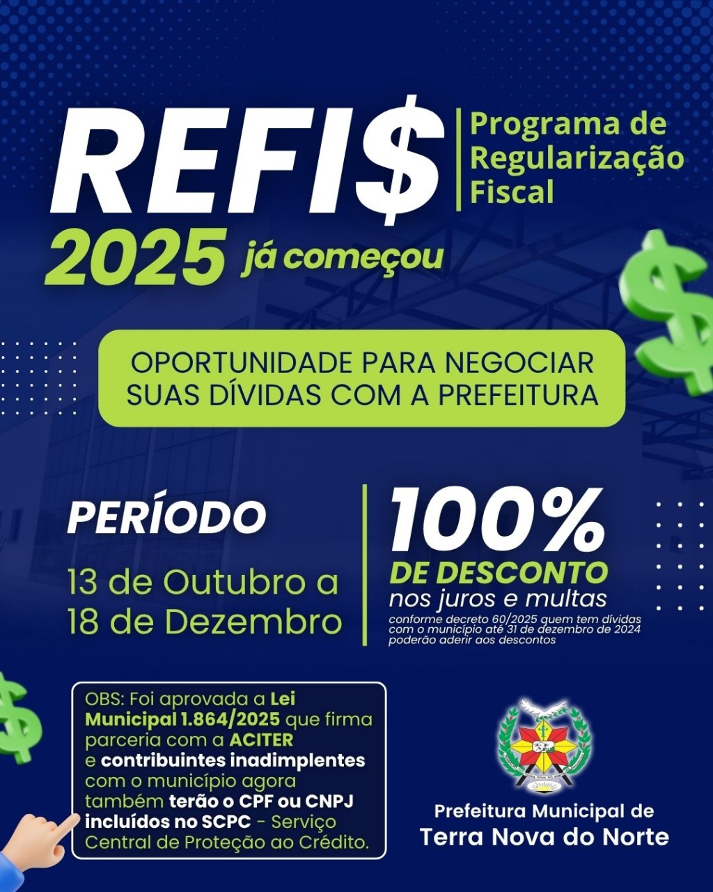 A Prefeitura Municipal de Terra Nova do Norte lançou o Programa de Recuperação Fiscal – REFIS 2025, uma excelente oportunidade para que contribuintes regularizem suas pendências com o município. O programa está em vigor de 13 de outubro a 18 de dezembro, oferecendo 100% de desconto nos juros e multas sobre débitos vencidos até 31 de dezembro de 2024.